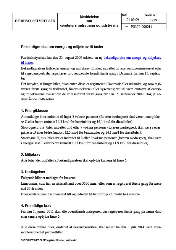 Meddelelse nr 1939 - Bekendtgørelse om energi- og miljøkrav til taxier - Om køretøjers indretning og udstyr mv.