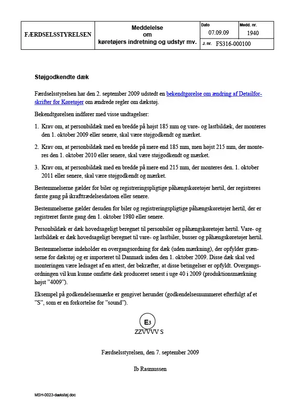 Meddelelse nr 1940 - Støjgodkendte dæk - Om køretøjers indretning og udstyr mv.