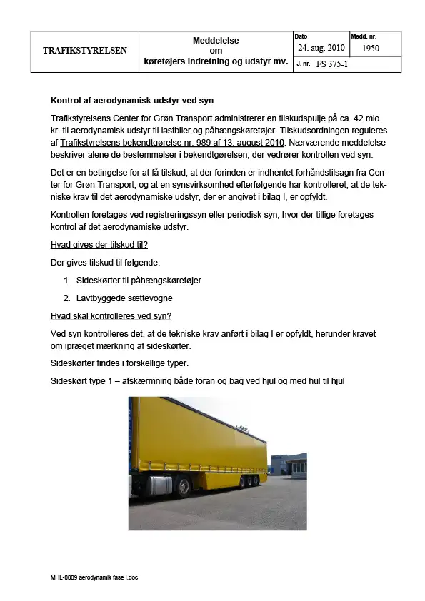Meddelelse nr 1950 - Kontrol af aerodynamisk udstyr ved syn - Om køretøjers indretning og udstyr mv.