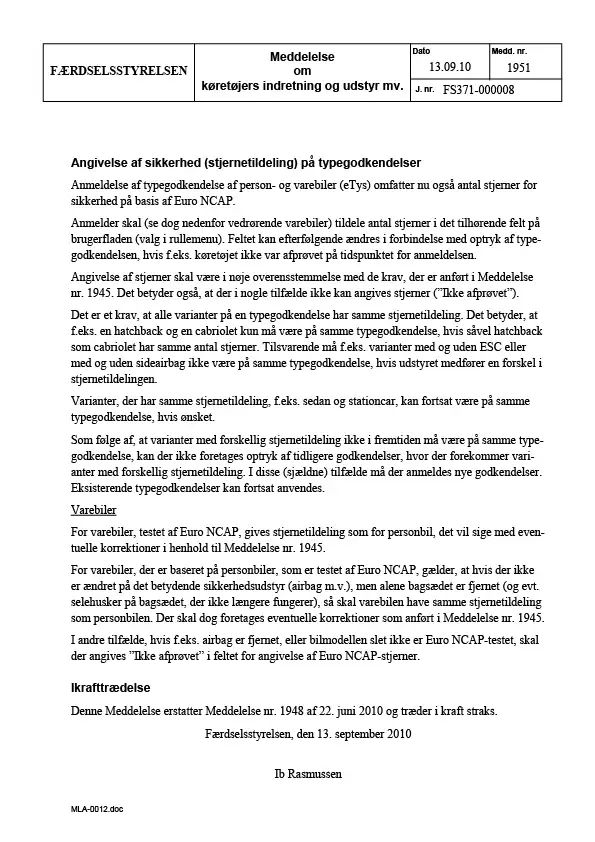 Meddelelse nr 1951 - Angivelse af sikkerhed (stjernetildeling) på typegodkendelser