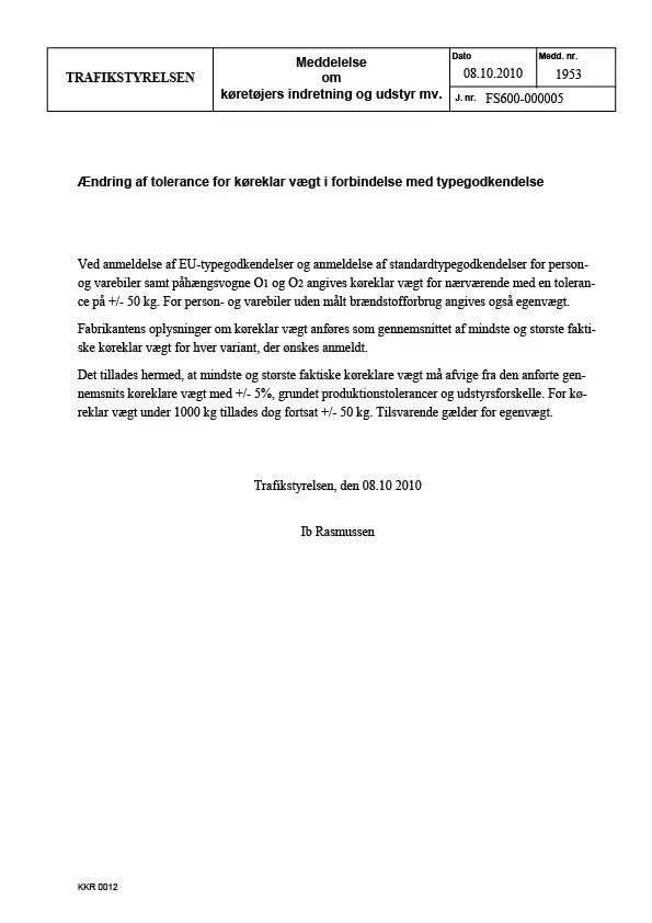 Meddelelse nr 1953 - Ændring af tolerance for køreklar vægt i forbindelse med typegodkendelse