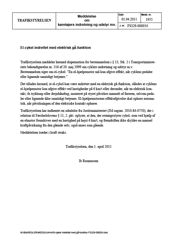 Meddelelse nr 1955 - El-cykel indrettet med elektrisk gå-funktion - Om køretøjers indretning og udstyr mv.