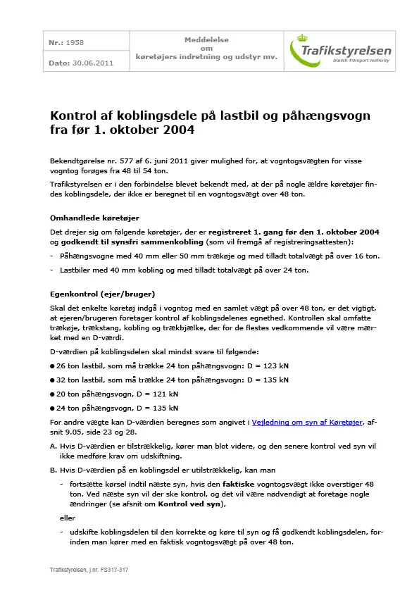 Meddelelse nr 1958 - Kontrol af koblingsdele på lastbil og påhængsvogn fra før 1. oktober 2004 - Om køretøjers indretning og udstyr mv.