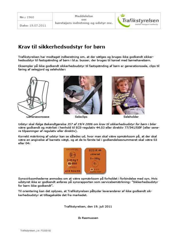 Meddelelse nr 1960 - Krav til sikkerhedsudstyr for børn - Om køretøjers indretning og udstyr mv.