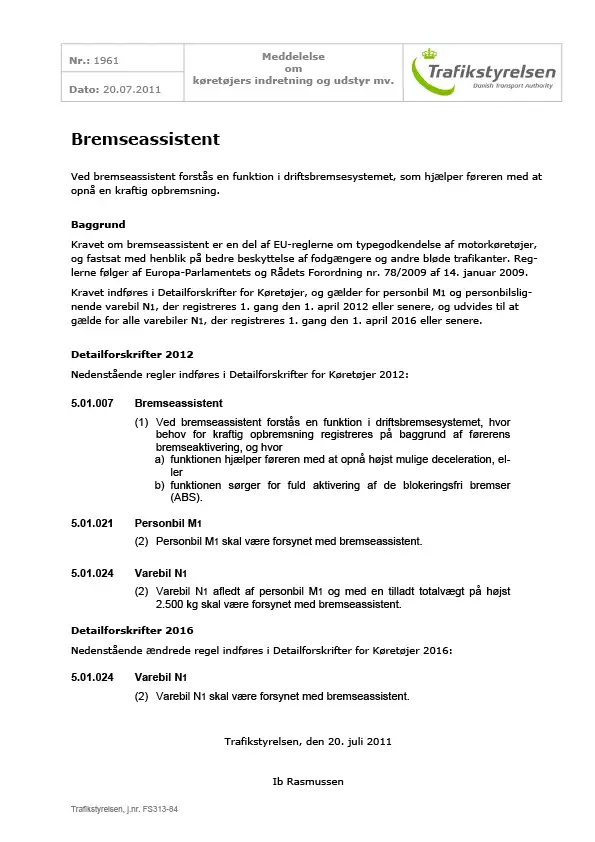 Meddelelse nr 1961 - Bremseassistent - Om køretøjers indretning og udstyr mv.