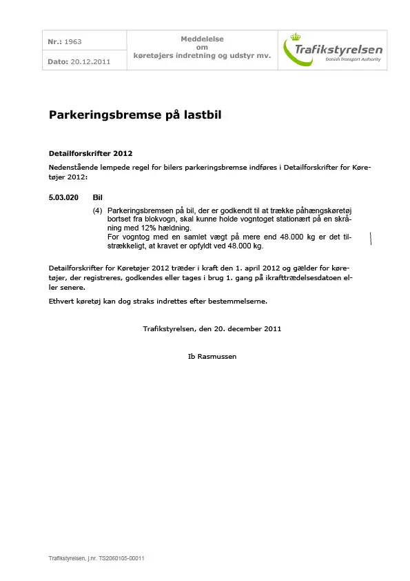 Meddelelse nr 1963 - Parkeringsbremse på lastbil - Om køretøjers indretning og udstyr mv.