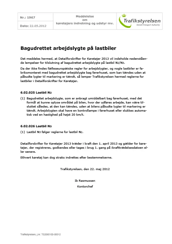 Meddelelse nr 1967 - Bagudrettet arbejdslygte på lastbiler - Om køretøjers indretning og udstyr mv.