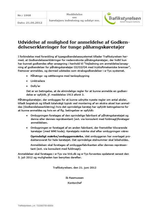 Meddelelse nr 1968 - Udvidelse af mulighed for anmeldelse af Godkendelseserklæringer for tunge påhængskøretøjer