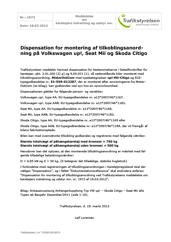 Meddelelse nr 1973 - Dispensation for montering af tilkoblingsanordning på Volkswagen up!, Seat Mii og Skoda Citigo - Om køretøjers indretning og udstyr mv.