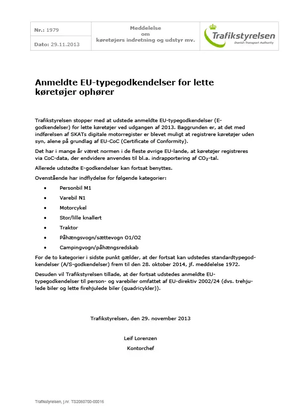 Meddelelse nr 1979 - Anmeldte EU-typegodkendelser for lette køretøjer ophører