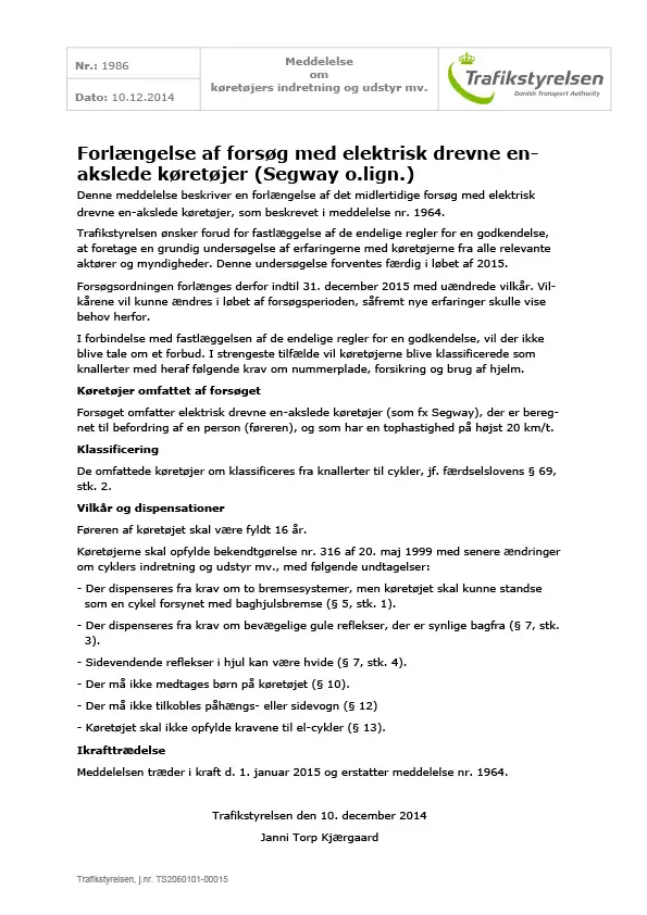 Meddelelse nr 1986 - Forlængelse af forsøg med elektrisk drevne enakslede køretøjer (Segway o.lign.) - Om køretøjers indretning og udstyr mv.