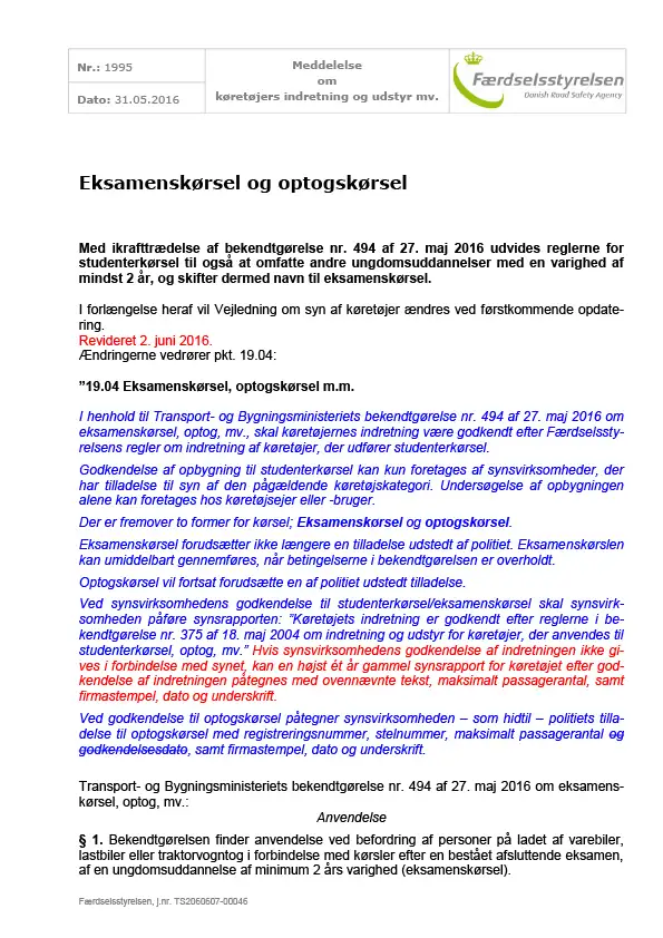 Meddelelse nr 1995 - Eksamenskørsel og optogskørsel - Om køretøjers indretning og udstyr mv.
