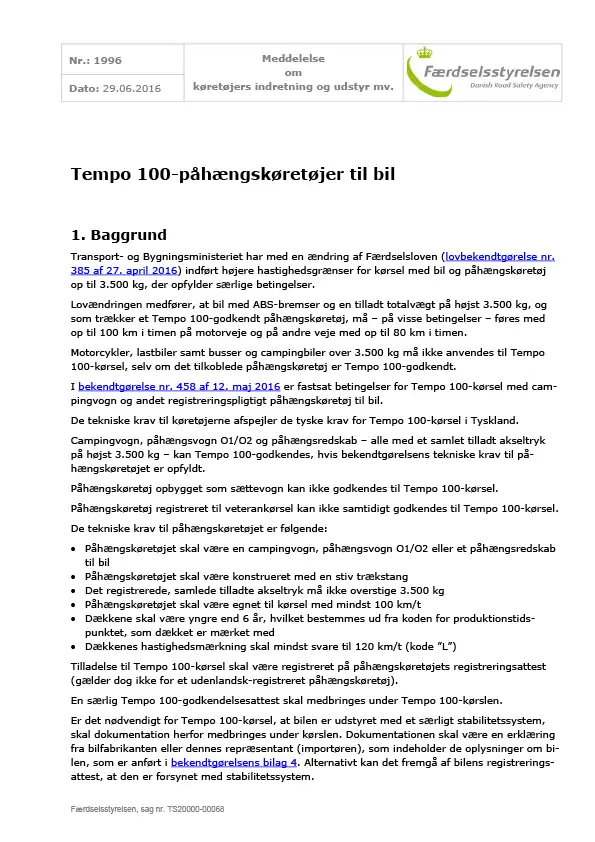 Meddelelse nr 1996 - Tempo 100-påhængskøretøjer til bil - Om køretøjers indretning og udstyr mv.