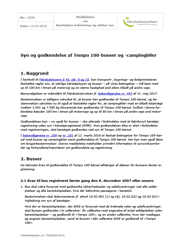 Meddelelse nr 2008 - Syn og godkendelse af Tempo 100-busser og -campingbiler - Om køretøjers indretning og udstyr mv.