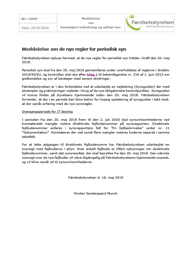 Meddelelse nr 2009 - Meddelelse om de nye regler for periodisk syn - Om køretøjers indretning og udstyr mv.
