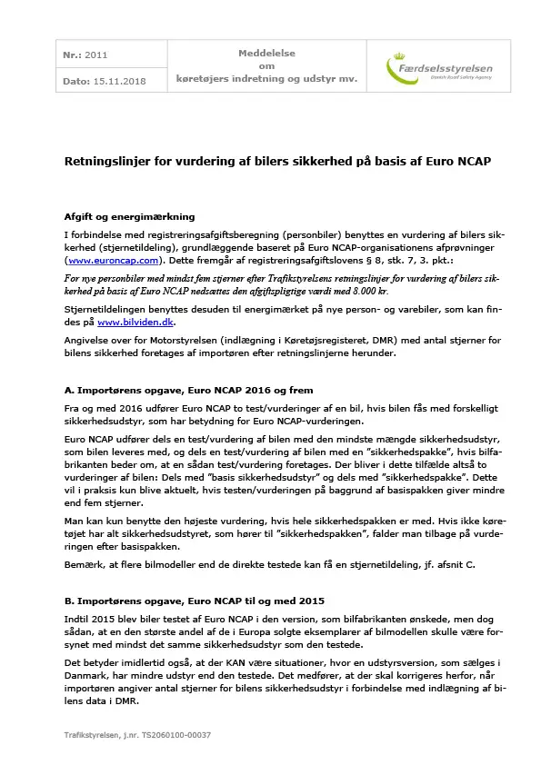 Meddelelse nr 2011 - Retningslinjer for vurdering af bilers sikkerhed på basis af Euro NCAP - Om køretøjers indretning og udstyr mv.
