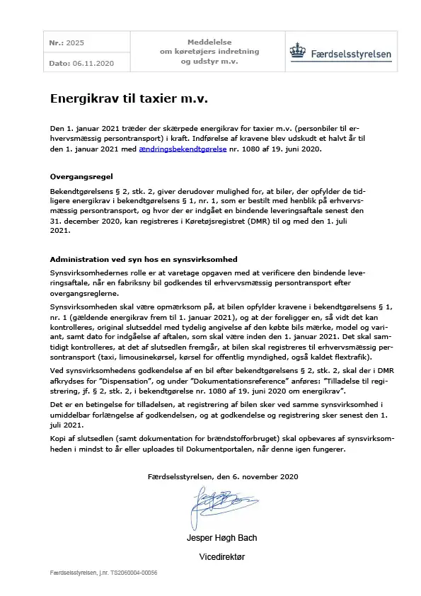 Meddelelse nr 2025 - Energikrav til taxier m.v. - Om køretøjers indretning og udstyr mv.