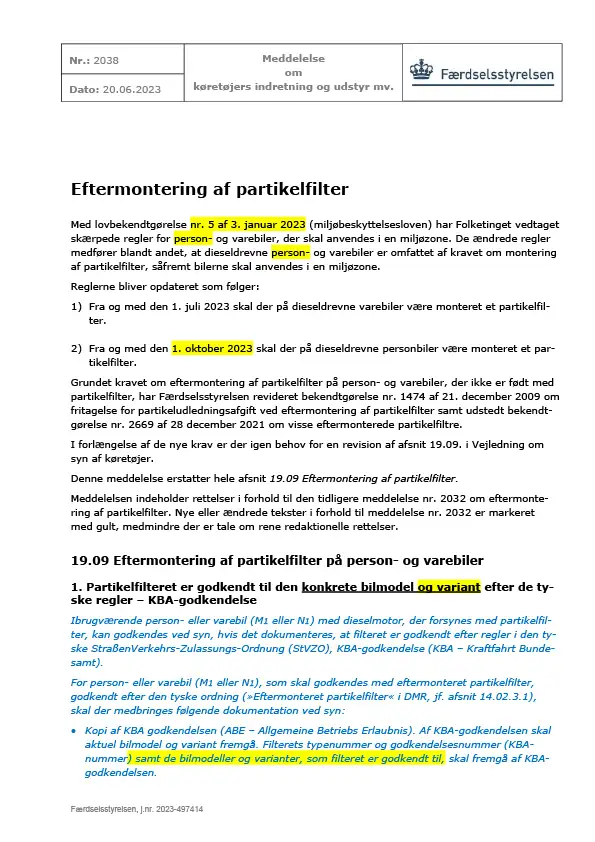 Meddelelse nr 2038 - Eftermontering af partikelfilter - Om køretøjers indretning og udstyr mv.