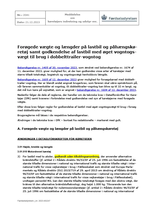 Meddelelse nr 2041 - Dfk VægtDimensioner og dobbelttrailer - Om køretøjers indretning og udstyr mv.