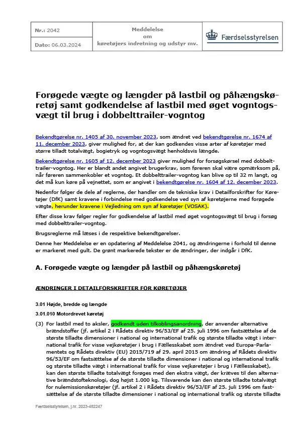 Meddelelse nr 2042 - Forøgede vægte og længder på lastbil og påhængskø-retøj samt godkendelse af lastbil med øget vogntogs-vægt til brug i dobbelttrailer-vogntog - Om køretøjers indretning og udstyr mv.