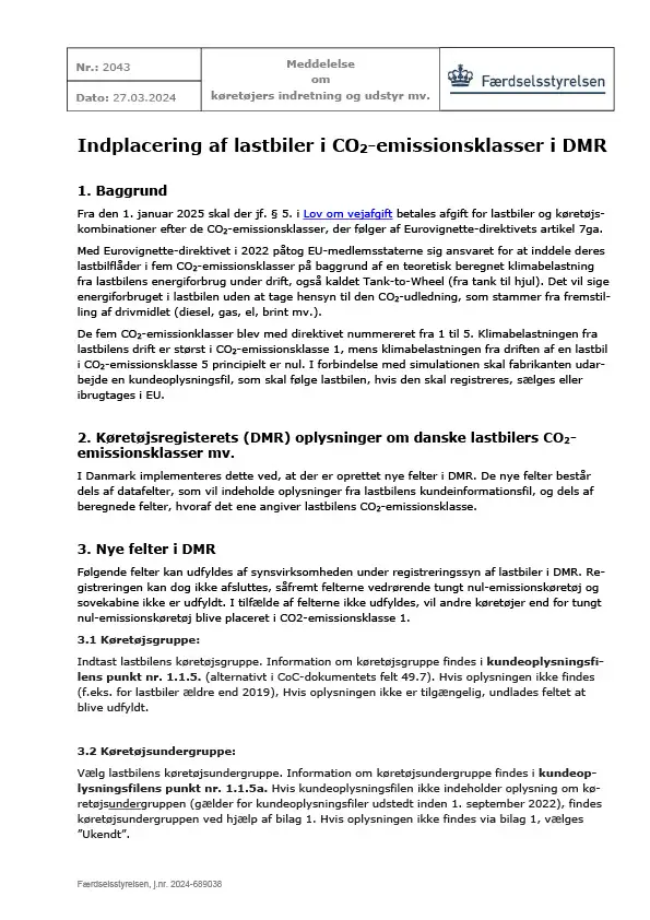 Meddelelse nr 2043 - Indplacering af lastbiler i CO2-emissionsklasser i DMR - Om køretøjers indretning og udstyr mv..pdf