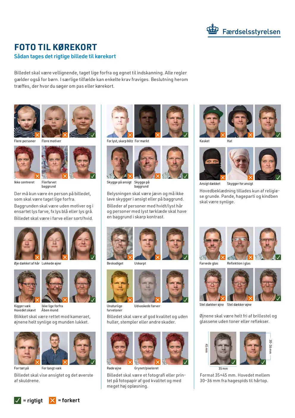 Reglerne for kørekortfoto følger EU-s regler for pasfoto. Neden for kan du se et billede, som viser dig, hvordan du overholder kravene til kørekortfotoet. Du kan medbringe dit eget kørekortfoto/pasfoto, når du ansøger, eller, du kan få taget et nyt foto ved fremmøde hos Borgerservice mod betaling. Læs mere om mulighederne på din kommunes hjemmeside.