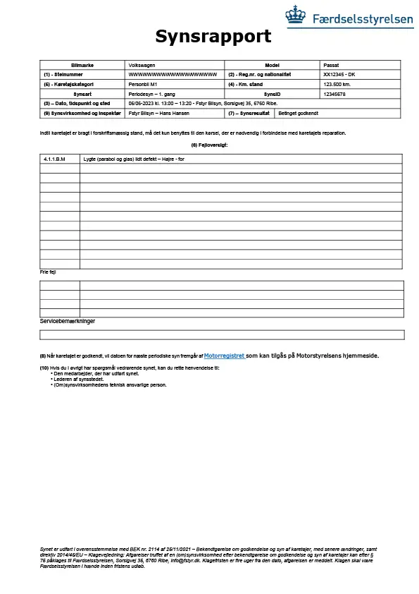 Eksempel på synsrapport - Betinget godkendt synsrapport