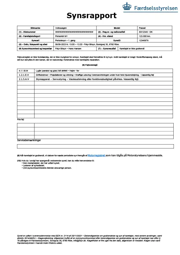 Eksempel på synsrapport - Køretøjet er ikke godkendt