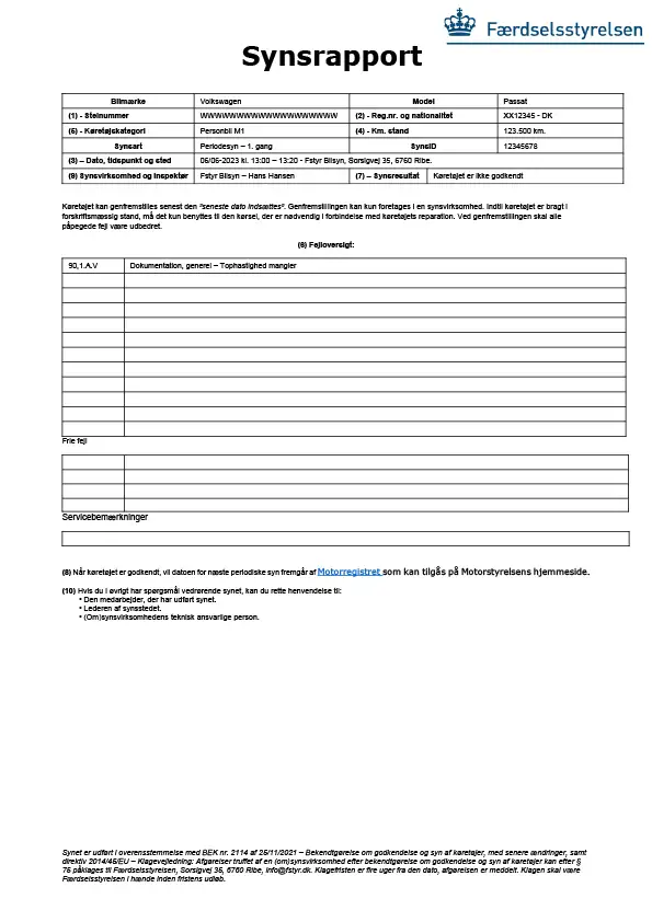 Eksempel på synsrapport - Køretøjet kan godkendes efter omsyn