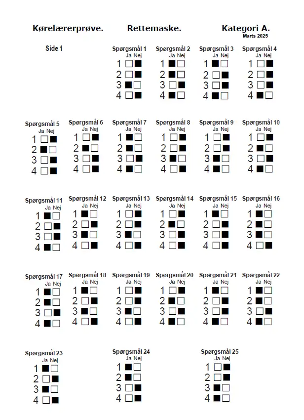 Facitliste - Forprøve til kørelæreruddannelsen - Kategori A - marts 2025