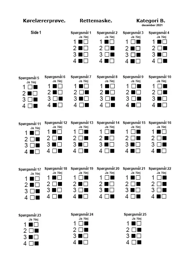 Facitliste - Forprøve til kørelæreruddannelsen - Kategori B - december 2021