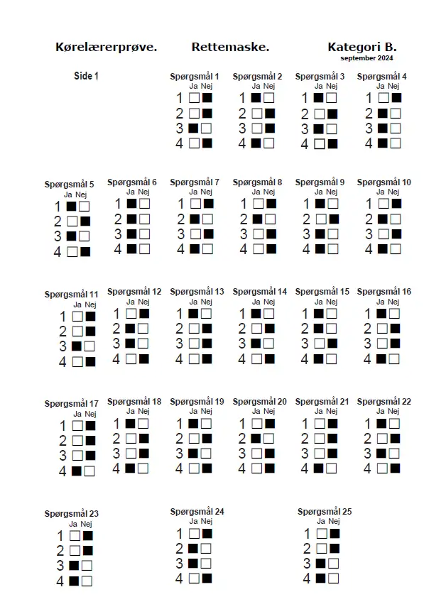 Facitliste - Forprøve til kørelæreruddannelsen - Kategori B - september 2024