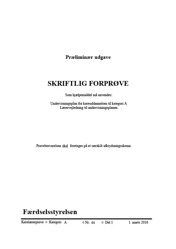 Forprøve til kørelæreruddannelsen - Kategori A - juni 2016