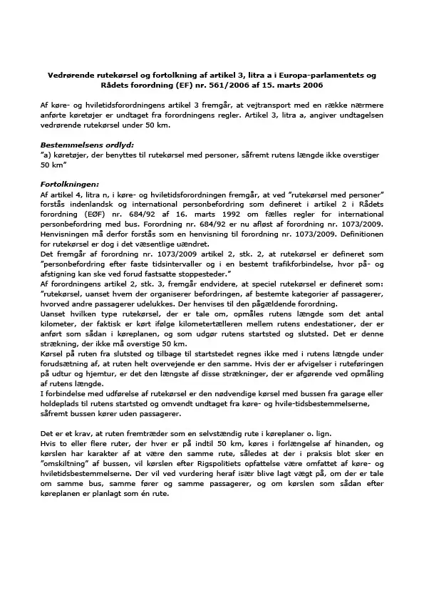 Af køre- og hviletidsforordningens artikel 3 fremgår, at vejtransport med en række nærmere anførte køretøjer er undtaget fra forordningens regler. Artikel 3, litra a, angiver undtagelsen vedrørende rutekørsel under 50 km.