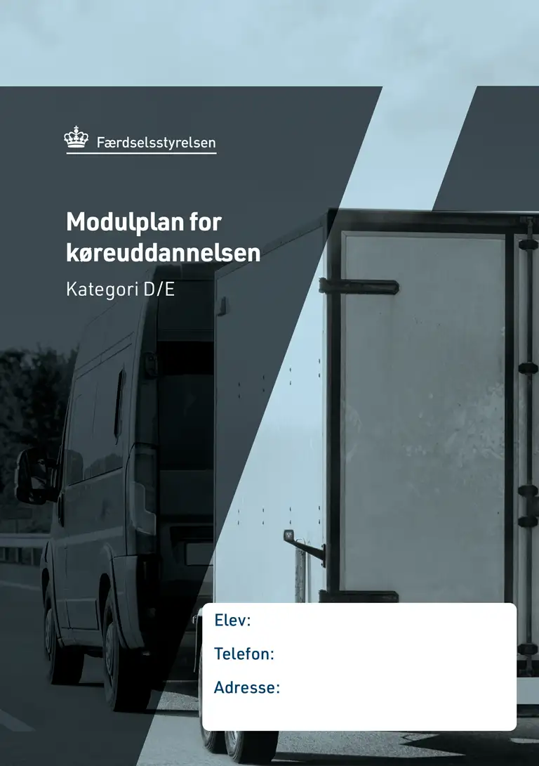 Her finder du modulplanen for køreuddannelsen til kategori D/E (stor bus med stort påhængskøretøj).