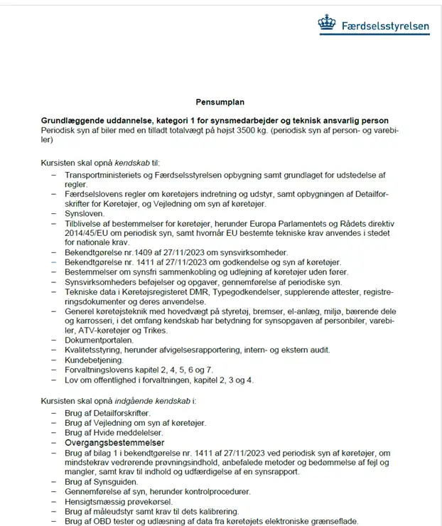 Pensumplan kategori 1 periodisk syn af lette køretøjer - 26.02.2024