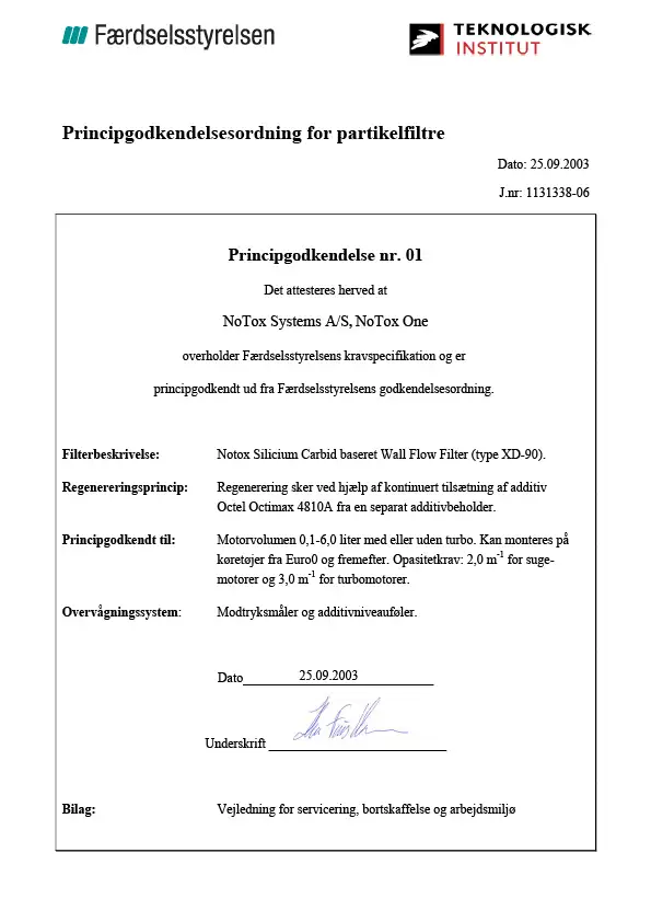 Principgodkendelses-ordning for partikelfiltre nr 01 - Notox One