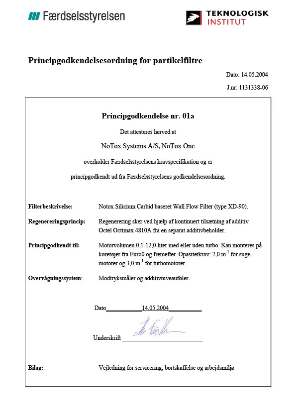 Principgodkendelsesordning for partikelfiltre nr 01a - Notox One