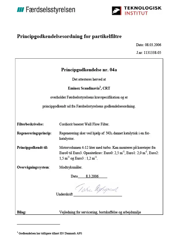 Principgodkendelsesordning for partikelfiltre nr 04a - Eminox Scandinavia CRT