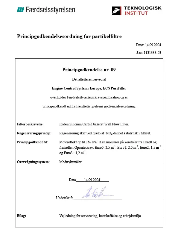 Principgodkendelsesordning for partikelfiltre nr 09 - Engine Control Systems Europe ECS PuriFilter