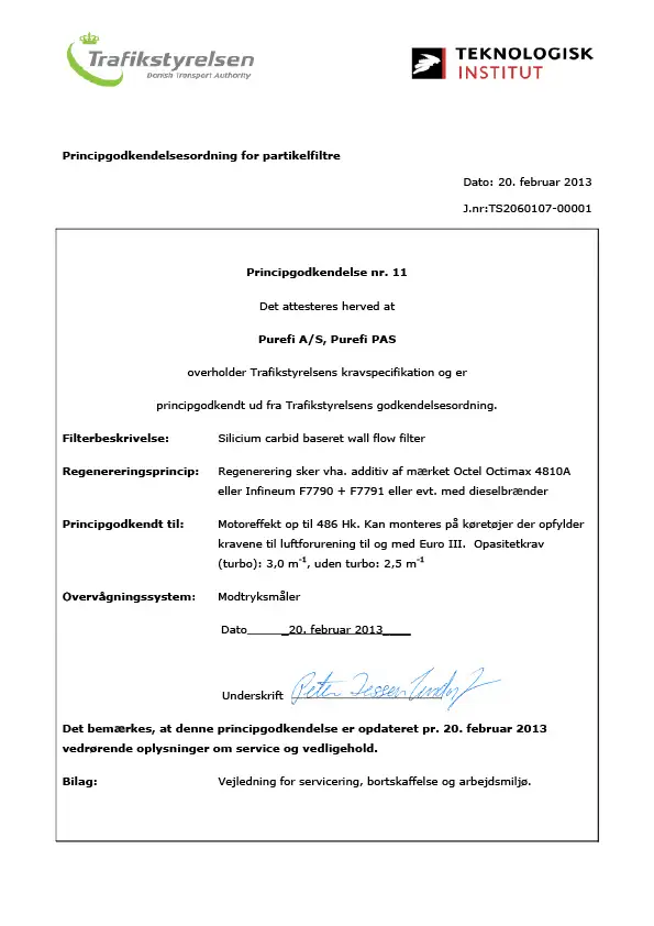 Principgodkendelsesordning for partikelfiltre nr 11 - Purefi AS Purefi PAS