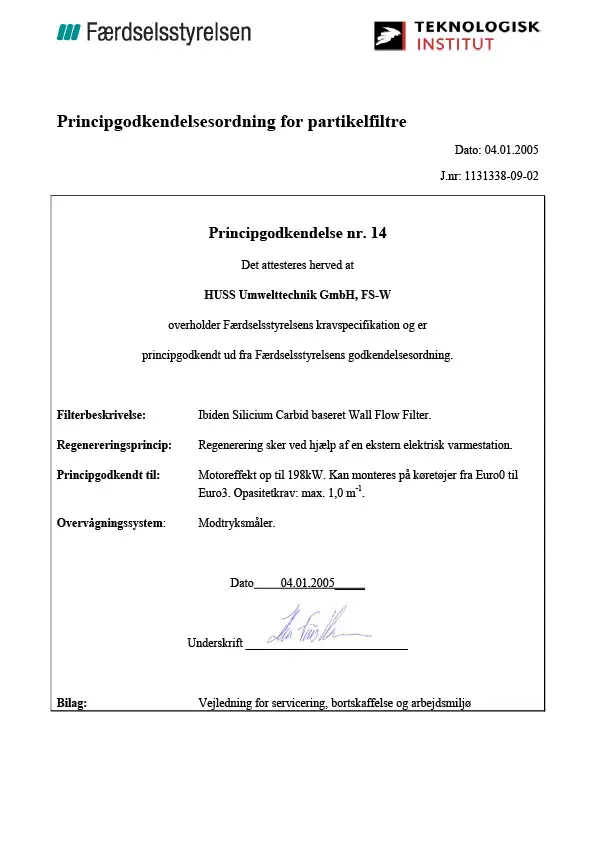 Principgodkendelsesordning for partikelfiltre nr 14 - HUSS Umwelttechnik GmbH FSW