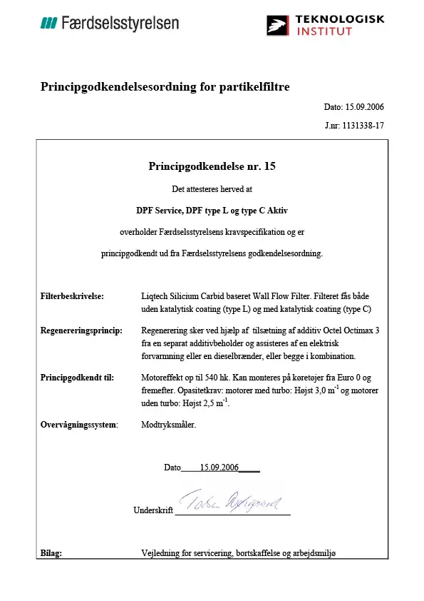 Principgodkendelsesordning for partikelfiltre nr 15 - DF Service DF type L og type C Aktiv