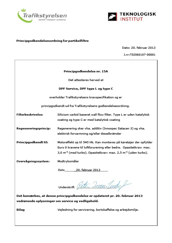 Principgodkendelsesordning for partikelfiltre nr 15a - DF Service DF type L og type C