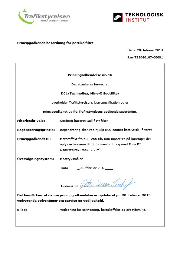 Principgodkendelsesordning for partikelfiltre nr 16 - DCLTechnoflex MineX Sootfilter
