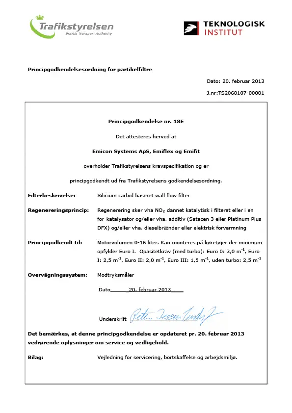 Principgodkendelsesordning for partikelfiltre nr 18e - Emicon Systems ApS Emiflex og Emifit