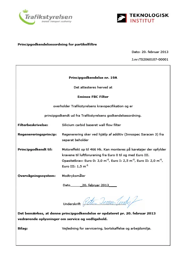 Principgodkendelsesordning for partikelfiltre nr 19a - Eminox FBC Filter