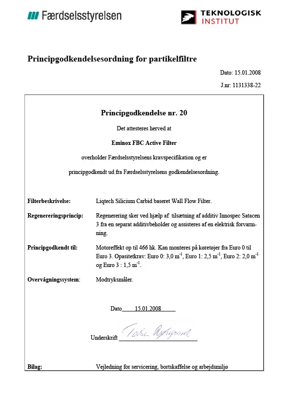 Principgodkendelsesordning for partikelfiltre nr 20 - Eminox FBC Active