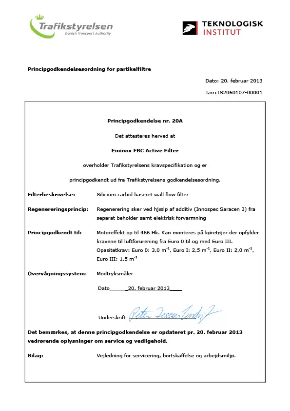 Principgodkendelsesordning for partikelfiltre nr 20a - Eminox FBC Filter