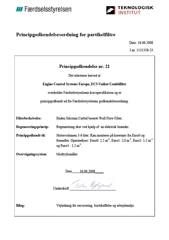 Principgodkendelsesordning for partikelfiltre nr 21 - Engine Control Systems Europe ECS Unikat Combifilter